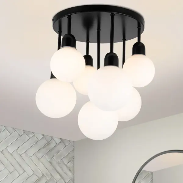 Elevate your space with the exquisite Broome Bathroom 7 Light Modern Opal Glass Ceiling Light. Crafted with a matt black finish, this modern piece featuring a stylish glass designed to enhance any ambiance. Experience perfect brightness with its E14 bulb compatibility, offering versatile lighting solutions. Whether in bathrooms or ensuites, this fixture seamlessly integrates with modern, contemporary, or Scandinavian decor, enhancing its aesthetic appeal.