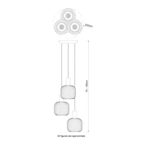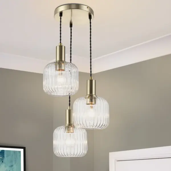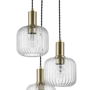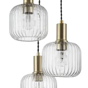Elevate your space with the exquisite Maple 3 Light Modern Ribbed Glass Cluster Pendant Light. Crafted with a brushed brass finish, this modern piece featuring a stylish glass pendant designed to enhance any ambiance. Designed for E27 bulbs, this fixture ensures brilliant lighting throughout your room. Whether in living rooms, dining areas, or bedrooms, this fixture seamlessly integrates with modern, contemporary, or Scandinavian decor, enhancing its aesthetic appeal.