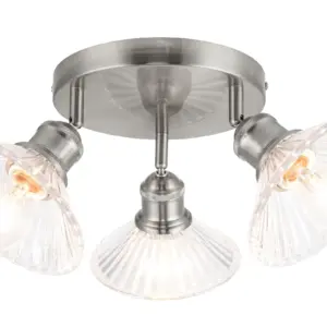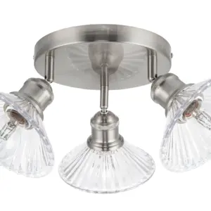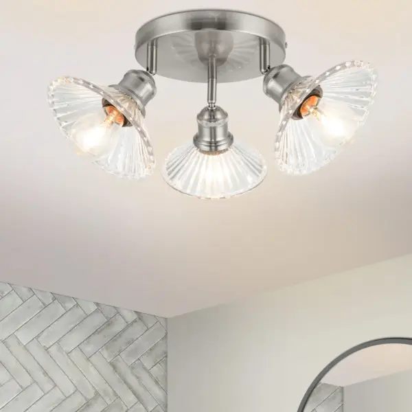 Illuminate your home with the captivating Milan Bathroom 3 Light Modern Round Plate Ribbed Glass Spotlight. Crafted with a brushed nickel finish, this modern piece its unique glass spotlight creating a mesmerizing play of light and shadow. Experience perfect brightness with its E27 bulb compatibility, offering versatile lighting solutions. Whether in bathrooms or ensuites, this fixture seamlessly integrates with modern, contemporary, or Scandinavian decor, enhancing its aesthetic appeal.