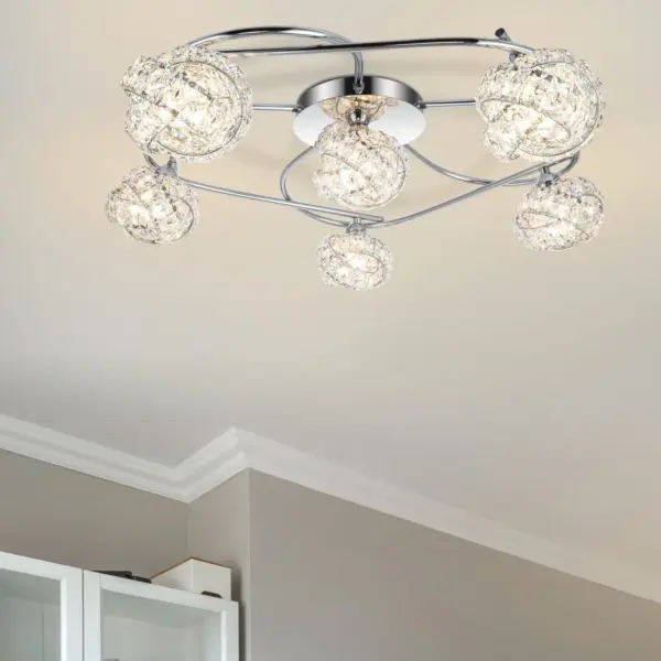 Introducing the stunning Mirri 6 Light Modern Glass Beaded Shade Ceiling Light. Crafted with a chrome finish, this modern piece featuring a stylish beaded shade designed to enhance any ambiance. Designed for G9 bulbs, this fixture ensures brilliant lighting throughout your room. A perfect addition to living rooms, dining areas, or bedrooms, its design harmonizes beautifully with modern, contemporary, or Scandinavian settings, creating an inviting atmosphere.
