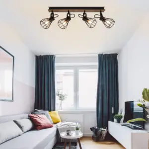 COSYLYTE Kendan 4 Light Matt Black Wire Shade Spotlight with Wooden Backplate